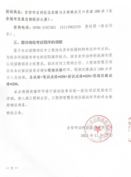 【公告】吉安市泊特新能源有限公司面向社會公開招聘考試擬入闈面試投檔分數線及面試有關事項的公告 熱